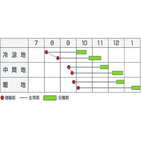 ●作型は、暖地の9月下旬まき12~1月どり栽培、中間地の9月中旬まき11~12月どり栽培等に