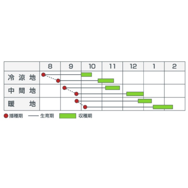 11~12月どり栽培、冷涼地の8月まき10月どり栽培等に適しています。