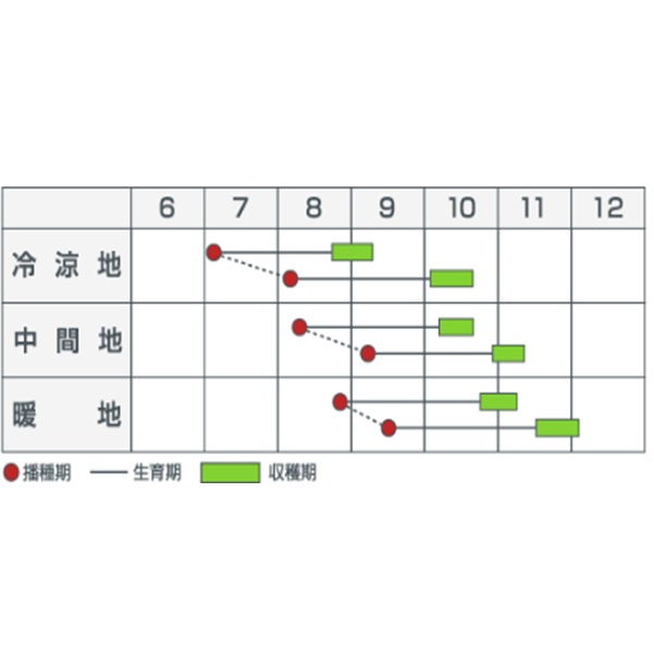 ●作型は、中間地の8月中旬~9月初まき、10月どり栽培、冷涼地の7月まき、