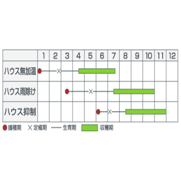 適応作型は、ハウス無加温作型、ハウス雨除け作型に最適で、抑制作型にも利用可能です。