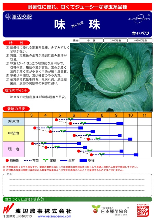 育苗、定植後の生育が順調に進み栽培が容易。 球重は1.3?1.5kg位の理想的な扁円形で収穫・箱詰め作業が容易。葉色が濃く
