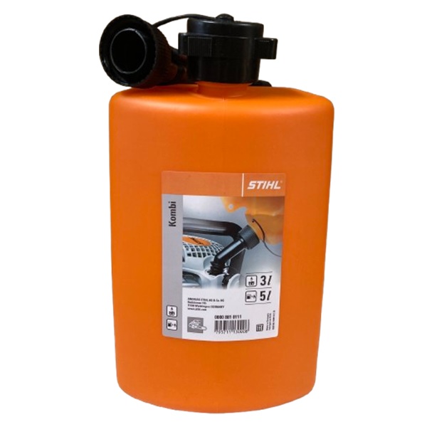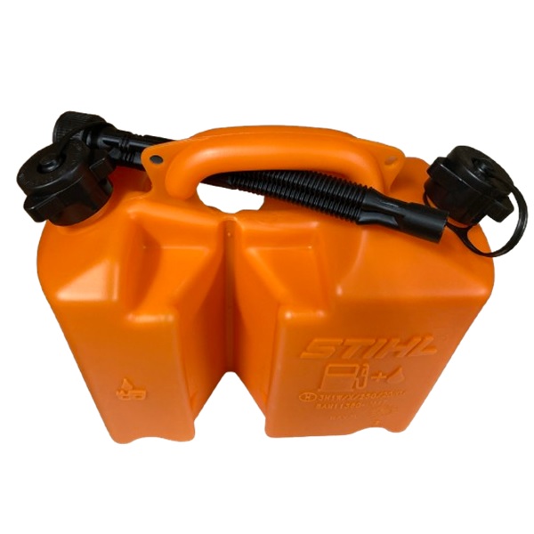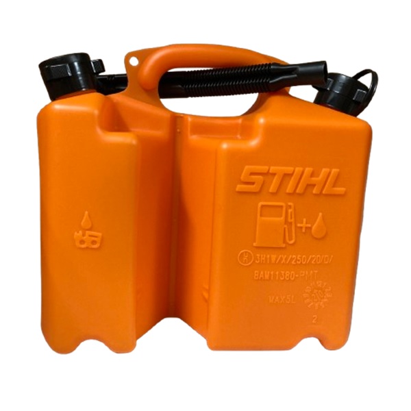 5Lの燃料と3Lのチェーンオイルを同時に運べるすぐれ物。