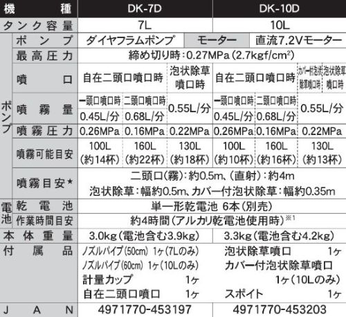 ・噴霧能力(mL/min):一頭口:450、 二頭口:680 泡状除草・カバー付泡状除草:550