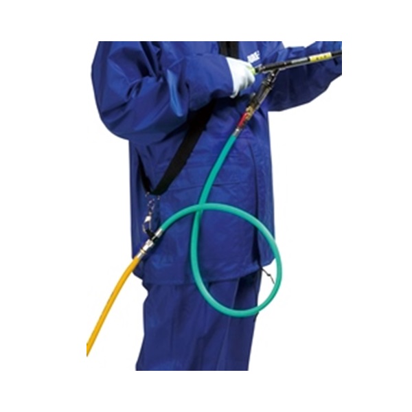 スプレーホースのねじれ防止器。(耐摩耗性回転ホース継手付)ピストル型(鉄砲噴口)利用時に威力発揮。ホース使用サイズ8.5mm/10mm用。セット明細:肩掛けベルト8.5mm/10mmホース1m付。