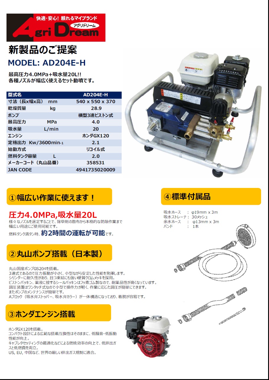 吸水ホースφ19mmX3m付(ストレーナー付)。