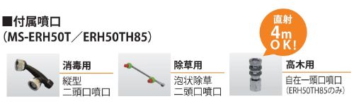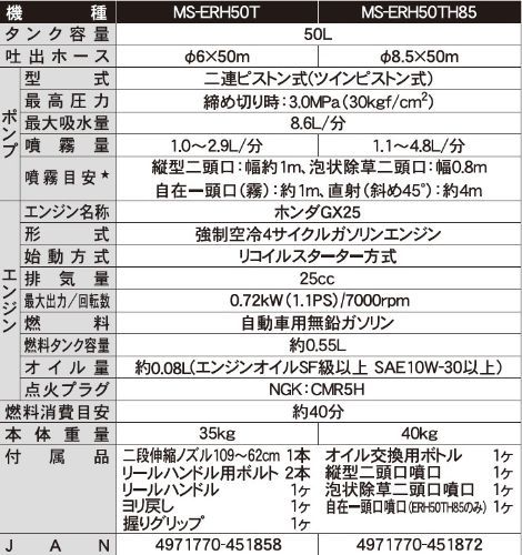 ]):締め切り時:3.0[30] ・吸水量(L/min):最大8.6 ・噴霧能力(mL/min):1100~4800 ・タンク容量(L):50 ・ノズル長(mm):1090~620 ・使用距離範囲(m):4(直射) ・ホース長さ(m):50 ・ホース径(Φmm):8.5 ・ポンプ:二連ピストン式 ・エンジン形式:4サイクル ホンダGX25 ・燃料:自動車用無鉛ガソリン ・燃料タンク容量(L):0.58 ・連続使用時間:約40分 ・接続ねじ:噴口接続部:G1/4 パイプ接続部:G1/4 ・付属品:ノズルパイプ・リールハンドル・より戻し・握り・オイルボトル・縦型2頭口・泡状除草2頭口・自在1頭口 ・本体質量(kg):40