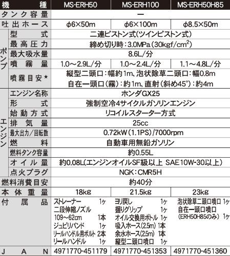 ]):締め切り時:3.0[30] ・吸水量(L/min):最大8.6 ・噴霧能力(mL/min):1100~4800 ・ノズル長(mm):1090~620 ・使用距離範囲(m):4(直射) ・ホース長さ(m):50 ・ホース径(Φmm):8.5 ・ポンプ:二連ピストン式 ・エンジン形式:4サイクル ホンダGX25 ・燃料:自動車用無鉛ガソリン ・燃料タンク容量(L):0.58 ・連続使用時間:約40分 ・接続ねじ:噴口接続部:G1/4 パイプ接続部:G1/4 ・付属品:ストレーナー・ノズルパイプ・ジュビリバンド・リールハンドル・ボルト・より戻し・握り・オイルボトル・吸入余水ホース・縦型2頭口・泡状除草2頭口・自在1頭口 ・本体質量(kg):23