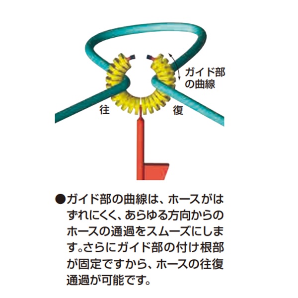 幅190mm×高760mm ・回転ローラをリング状に配した構造なので、あらゆる方向からのホースの通過がなめらかです。鮮やかな黄色が圃場で目立ちます。