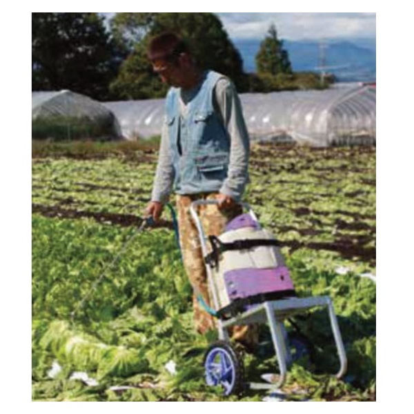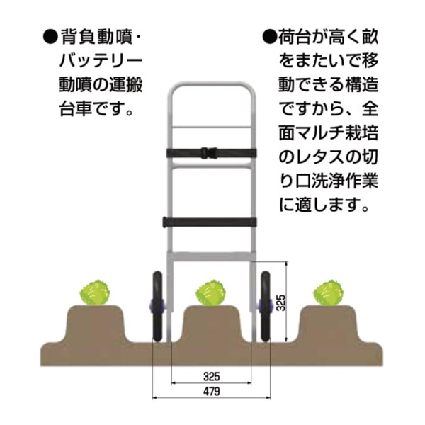 背負動噴・バッテリー動噴の運搬台車です。 荷台が高く畝をまたいで移動できる構造ですから、全面マルチ栽培のレタスの切り口洗浄作業に最適です。