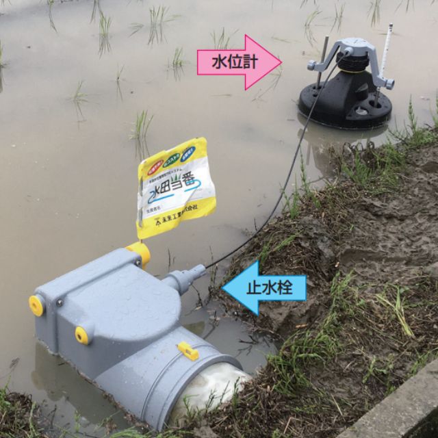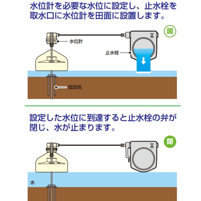 水田の水位が設定した水位に達すると止水栓の弁が閉じ、水が止まるので、