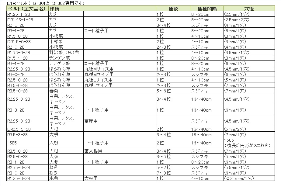 一覧表に示されたベルトは、各作物毎に全国標準的に使用されているものを表示したもので、