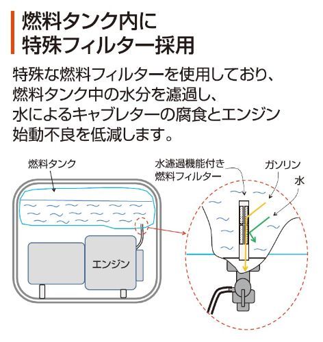 〇特長:始動不良を低減する特殊燃料フィルター採用。キャブレター詰まりを防止する