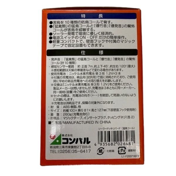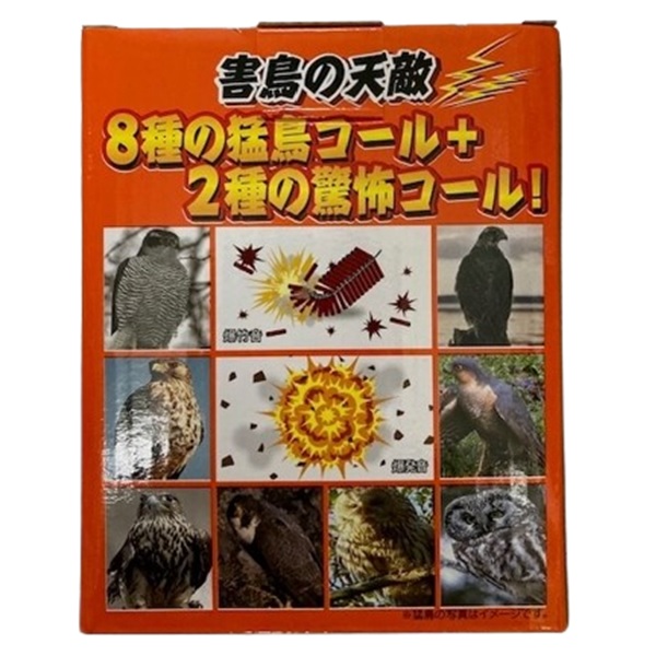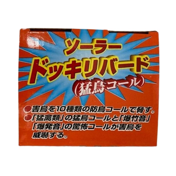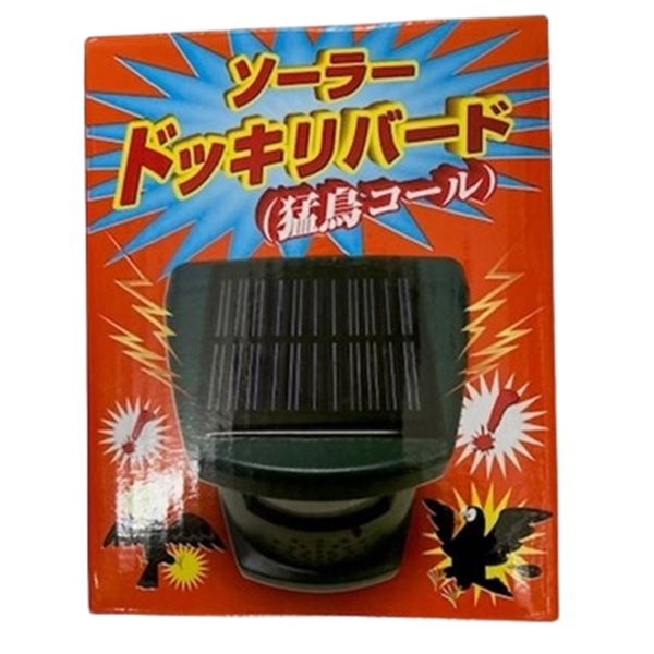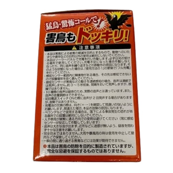 害鳥を10種類のコールが脅す。エコ、ソーラー発電で環境に優しく経済的。感知センサー範囲約7m。