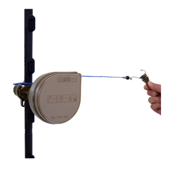電気柵の出入り口で使用。自動で柵線を巻き取り、場所もとらず便利です。(フリーガイシ1個付属)