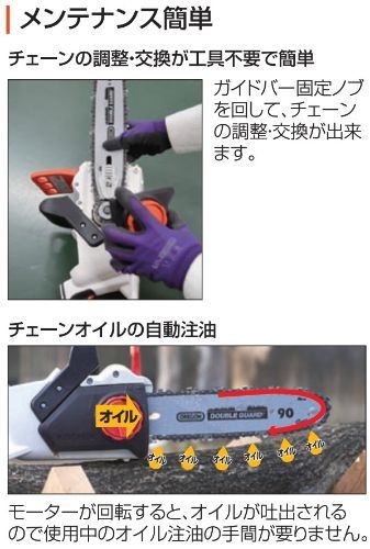 チェーン調整と交換は工具不要、チェーンオイルは自動給油タイプ