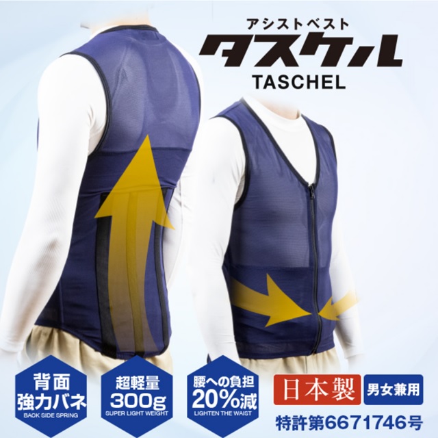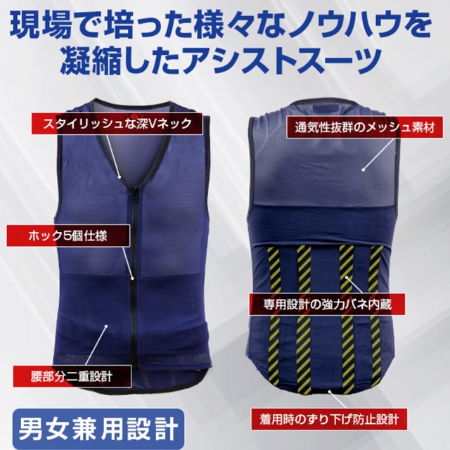 ベストのように簡単に着用できて、背面に配された4本のスプリングが腰への負担を大幅に軽減します。重量物の持ち上げ等腰への負担が大きい作業へのアシストスーツとしてだけではなく、テレワークでの長時間のデスクワーク等同じ体制から発生する腰痛を軽減します。