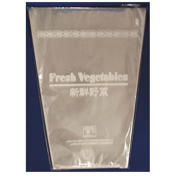 このフィルムは、野菜鮮度保持の為、特殊(防曇)加工されているF&Gフィルムです。文字は「Fresh Vegetables 新鮮野菜」、プラマーク入り、コーナーカット。