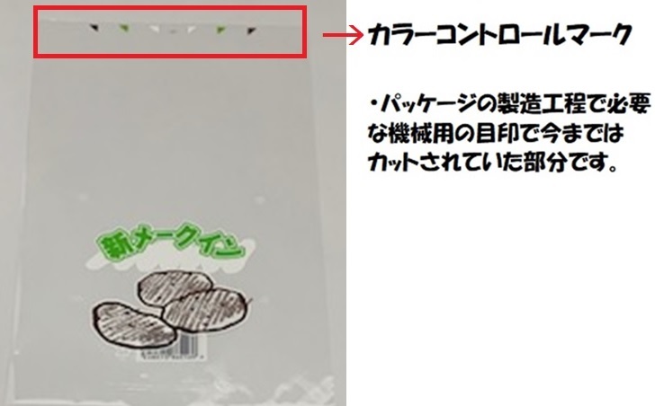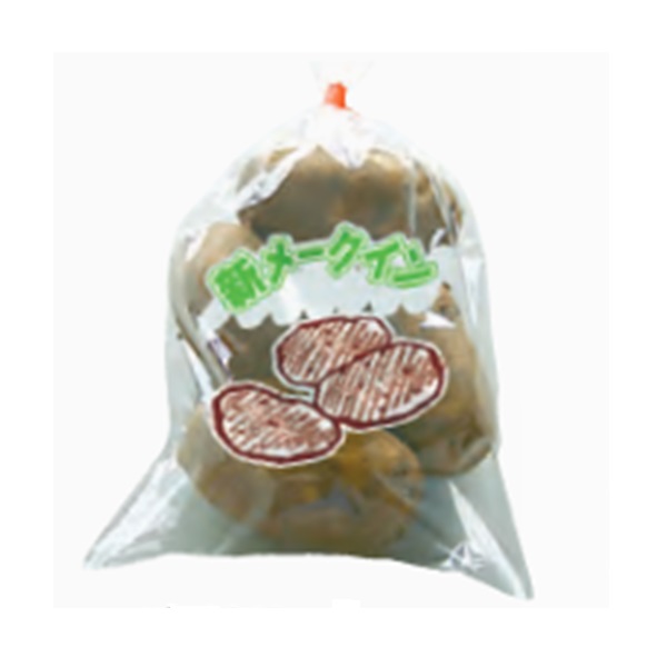 OPP防曇、4穴、プラマーク入、印字「新メークイン」、イラスト入。