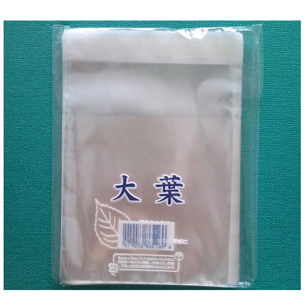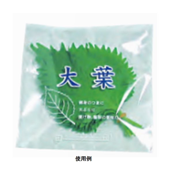 OPP防曇、穴無、プラマーク入、印字「大葉」、イラスト入。スパッシュ四角袋テープ付。
