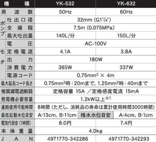 〇仕様:・吐出量(L/min):140・全揚程(m):7.5・周波数(Hz):60