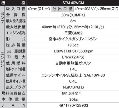 工進 エンジンポンプ 40ミリ(4サイクル)SEM-40WGM