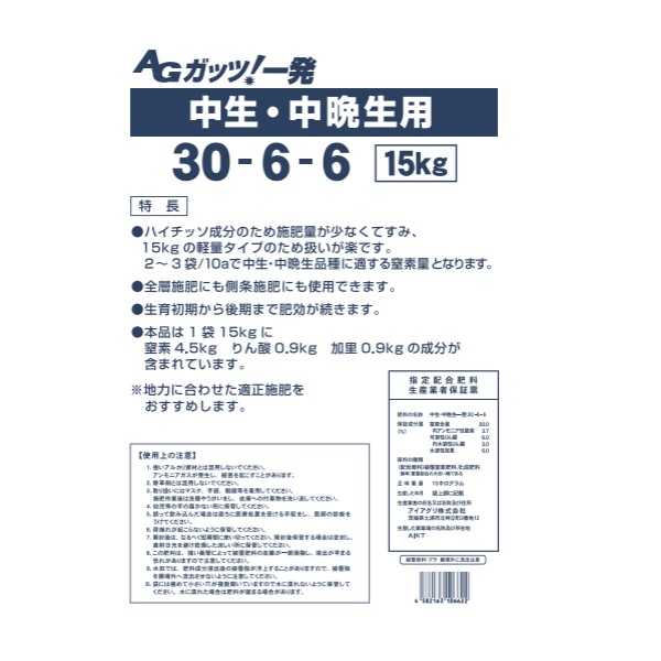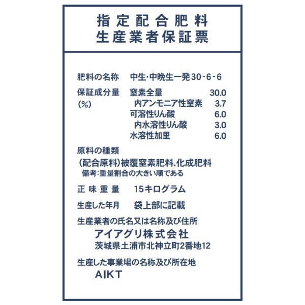 ●本品は1袋(15kg)に窒素4.5kg、りん酸0.9kg、加里0.9kgの成分が含まれています。
