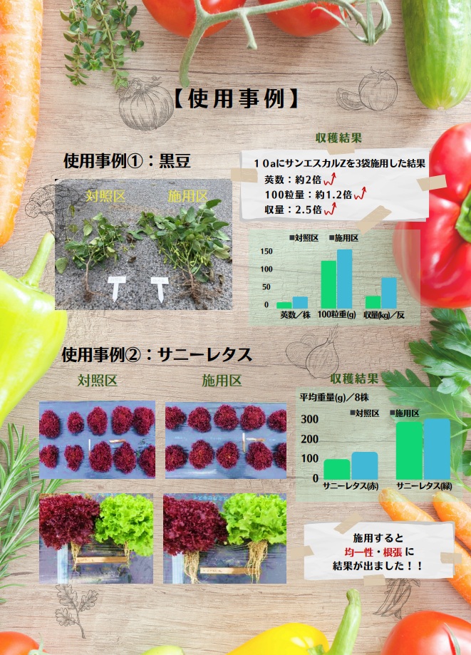 ①トマト栽培に使用。今年は雨が少なく猛暑でしたのでトマトの尻腐れや実割れが多く出ました。しかし石灰の代わりにサンエスカルZを使用した圃場では、実割れや尻腐れが無く、着色も良く収量まで増えました。即効性があるので追肥に使えるのも良いですね。
