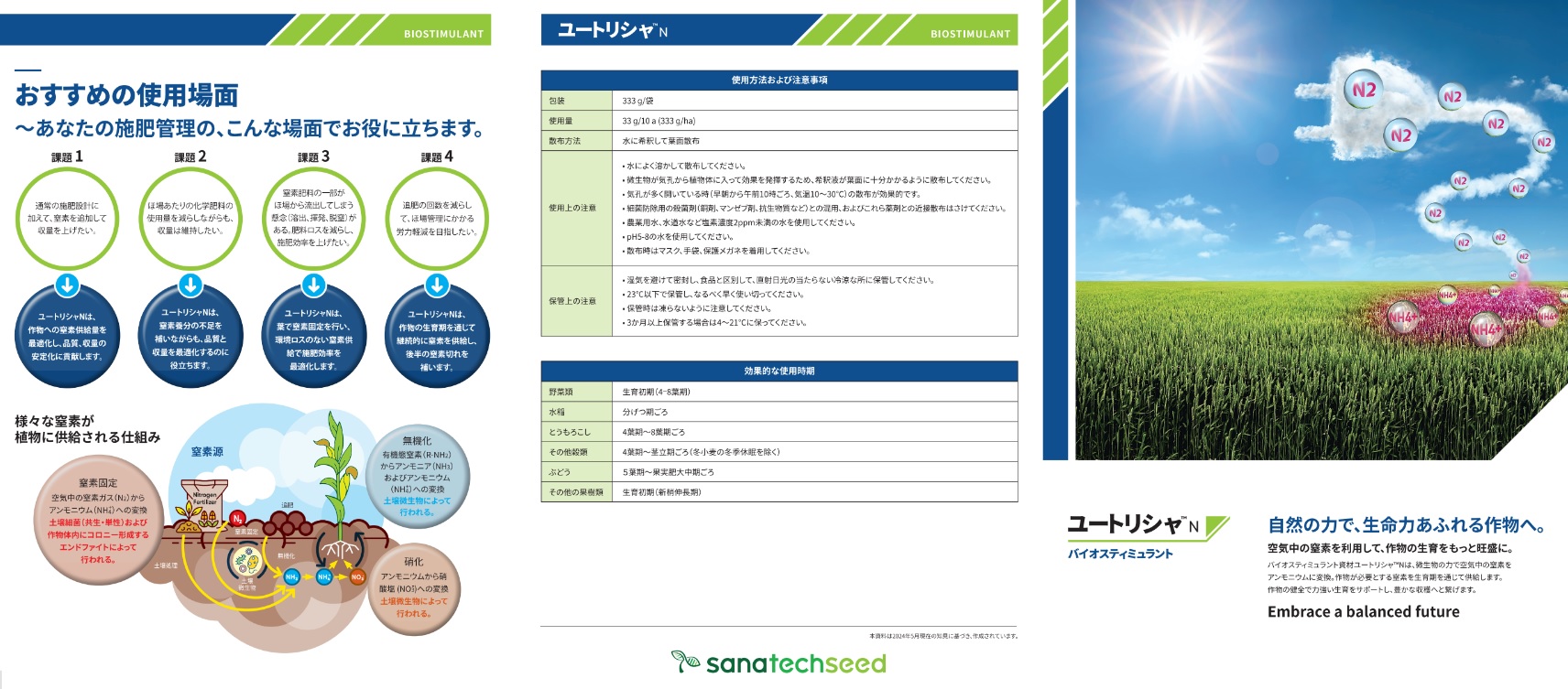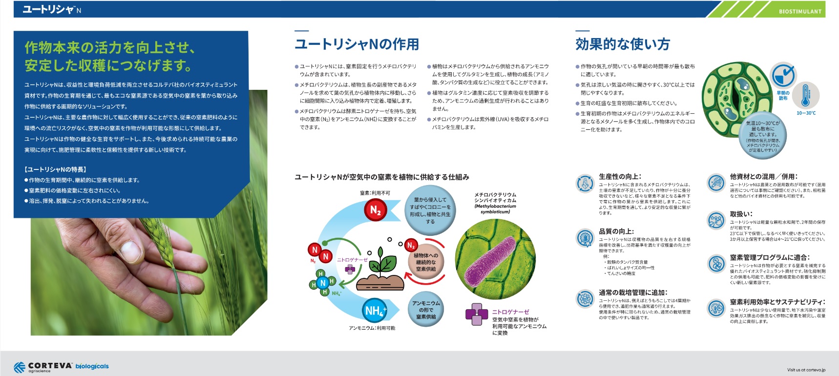 ユートリシャNは窒素固定細菌Methylobacterium symbioticum(メチロバクテリウム シンバイオティカム)を含有し、微生物の働きにより空気中の窒素を植物が利用可能なアンモニウムに変換して供給するバイオスティミュラント製品です。