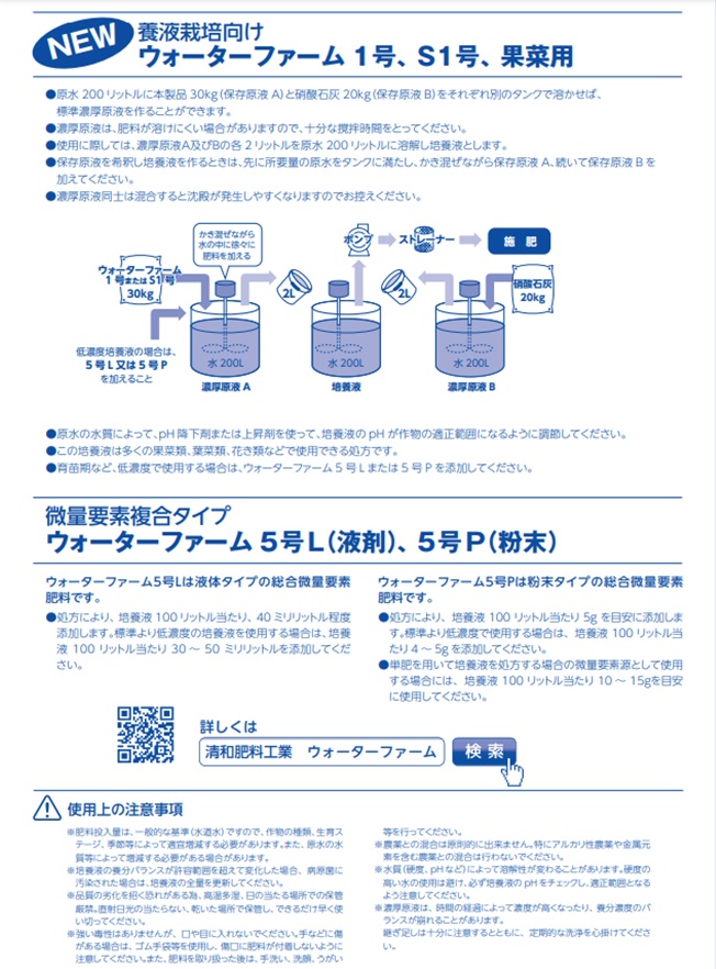 ●育苗期など、低濃度で使用する場合は、ウォーターファーム5号Lまたは5号Pを
