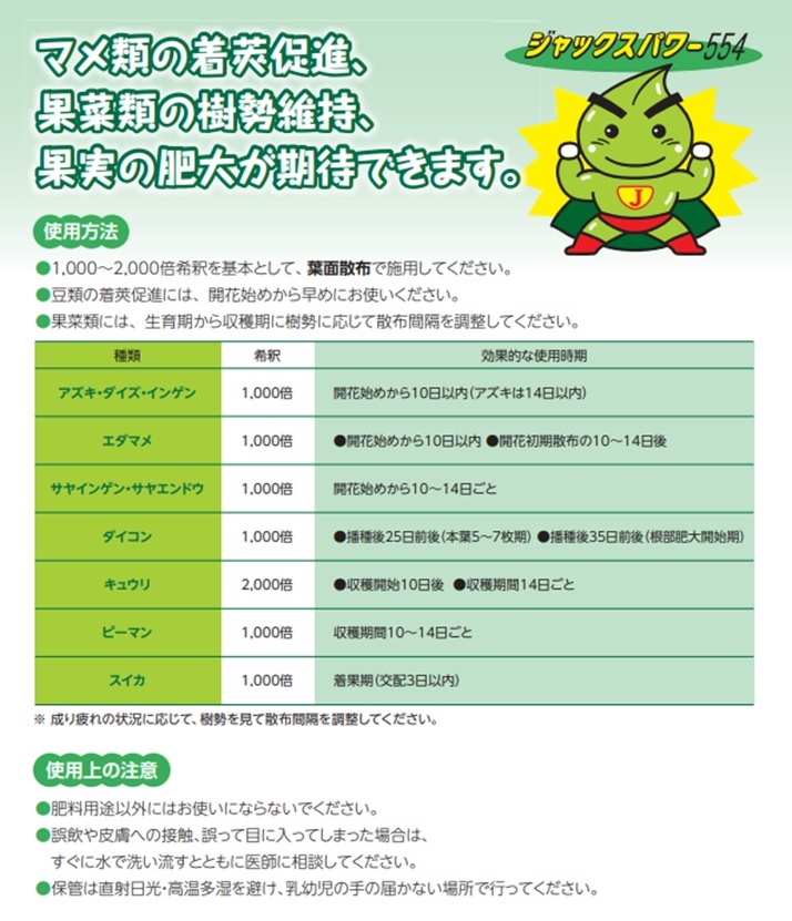・豆類の着莢促進には、開花始めから早めにお使いください。