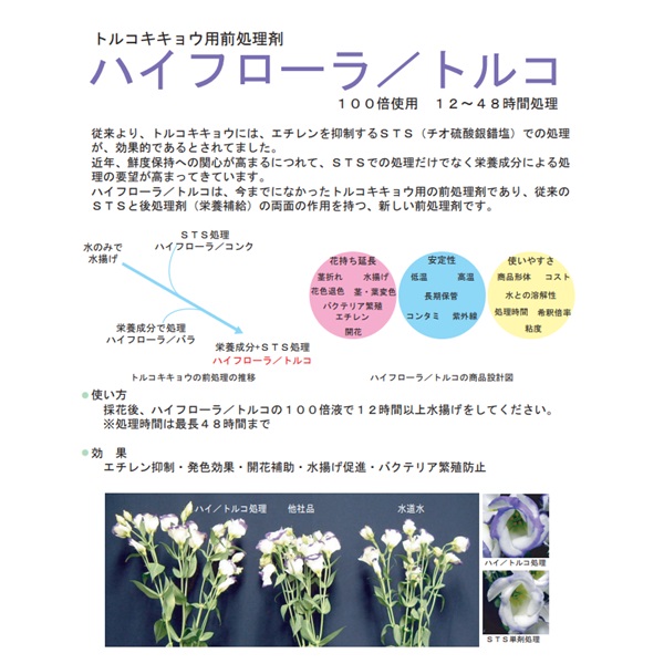 STSと糖の効果で花持ちだけでなく、花色を鮮やかにし、蕾もキレイに咲かせます。また水カビやバクテリアの繁殖も抑えます。