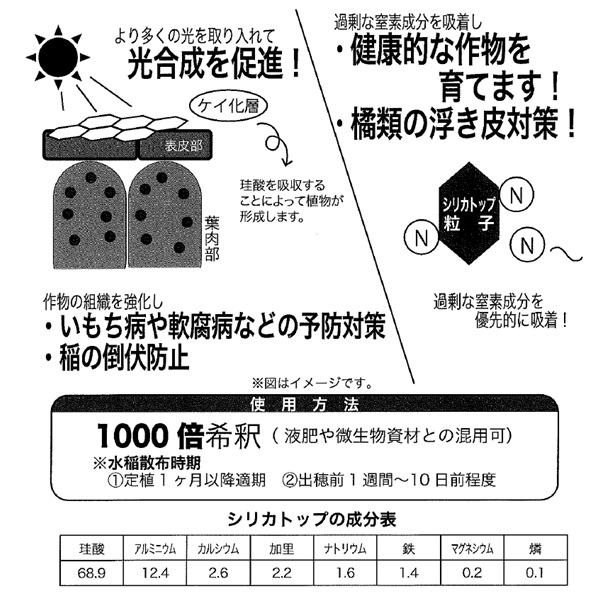 ・作物の組織を強化し、いもち病や軟腐病などの予防対策。稲の倒伏防止。
