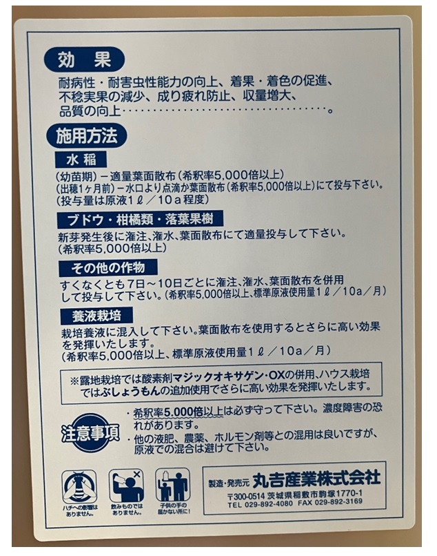 ・他の液肥、農薬、ホルモン剤等との混用は良いですが、原液での混合は避けて下さい。