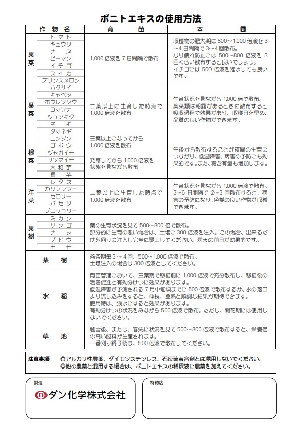 ・他の農薬と混用する場合は、ボニトエキスの稀釈液に農薬を加えてください。
