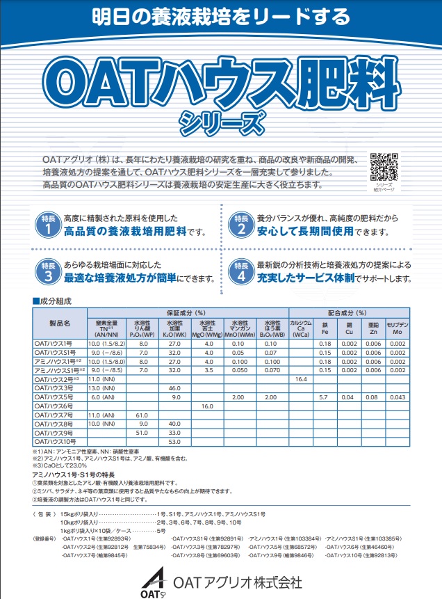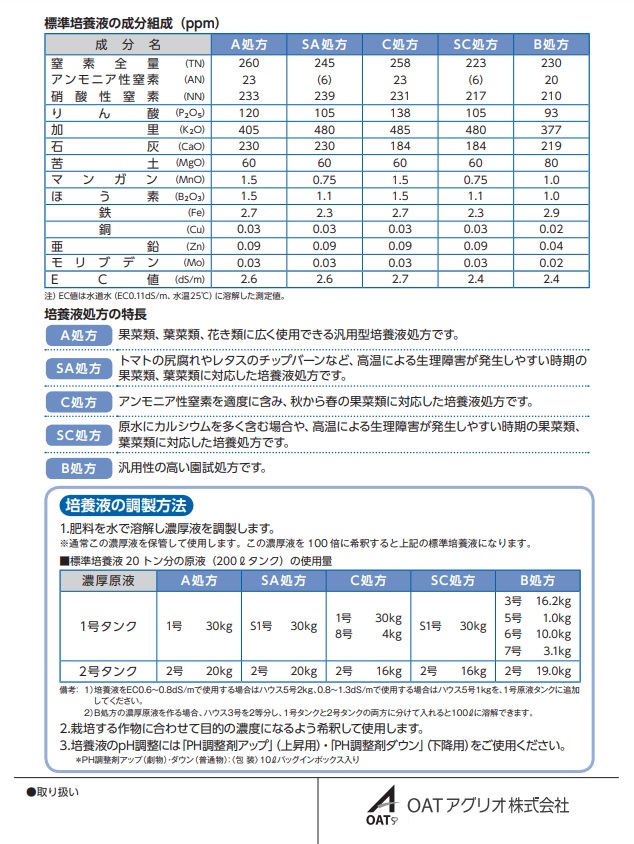 水耕栽培やロックウール栽培の生育に必要な養分を含む培養液として、普及しています。