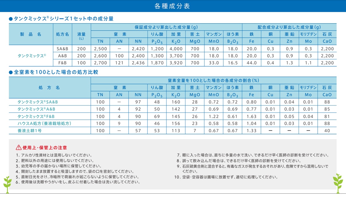 ・メーカーの養液栽培の肥料処方「ハウスA処方」に近い肥料組成です。