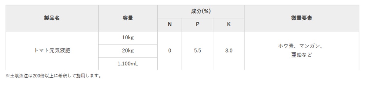 通常液肥と交互にこのトマト元気液肥を施用することで、吸収量の多いカリを過不足なくこまめに供給することが可能となり、健全な生育が図れます。