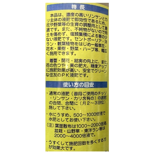 窒素(N)、リン酸(P)、カリ(K)の割合が、 1:12:10で、花・野菜の生育を調整するための液肥です。窒素を効かせず野菜・花を元気づけたい時に利用をお勧めします。