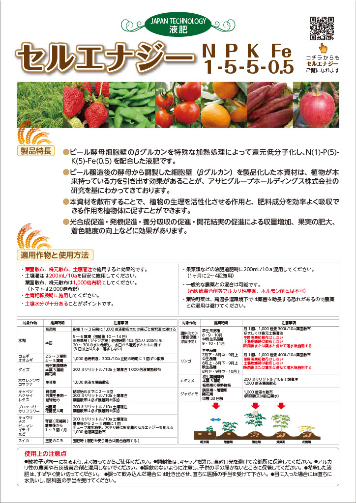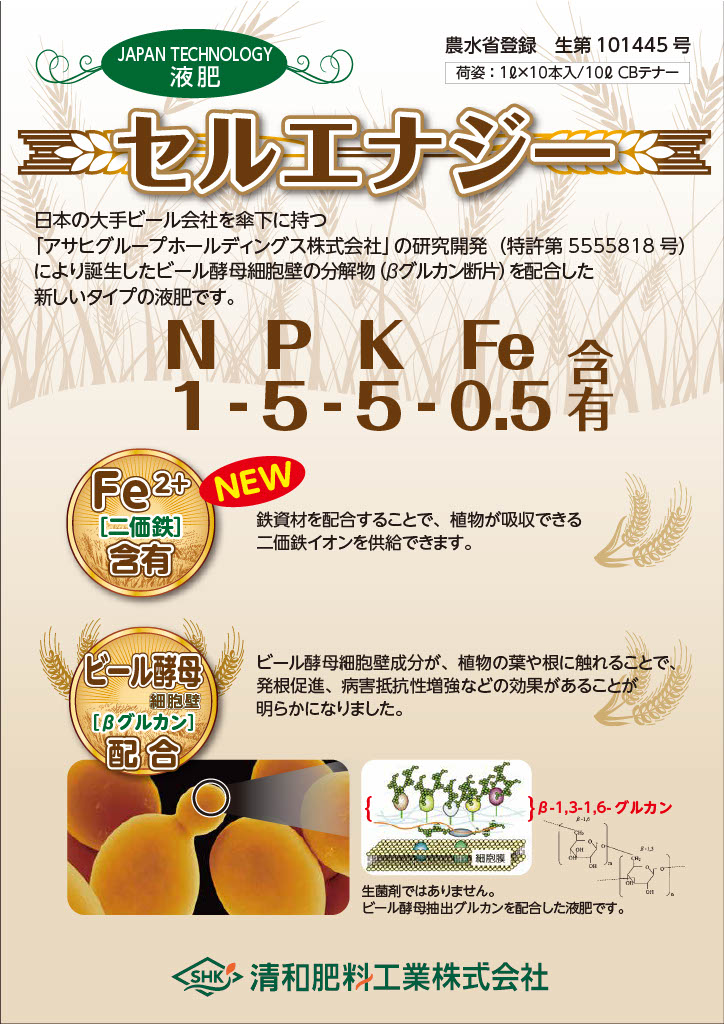 ビール酵母細胞壁のβグルカンを特殊な加熱処理によって還元低分子化し、窒素(N)1、リン酸(P)5、カリウム(K)5、鉄(Fe)0.5を配合した液肥です。