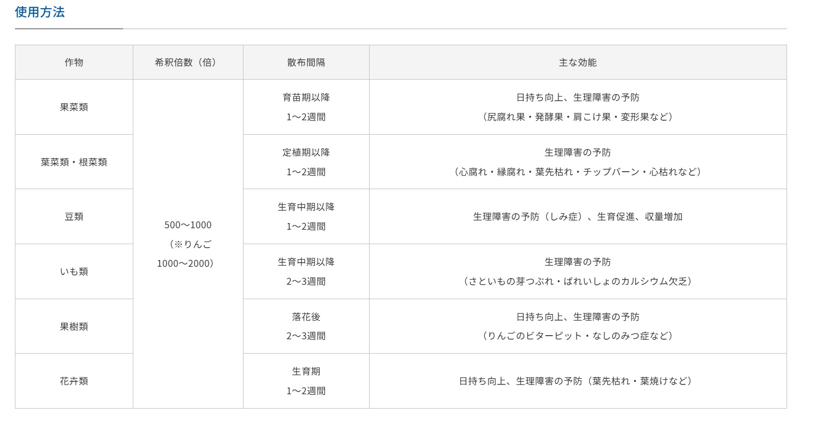 特に生育が旺盛な時期やステージでは常にカルシウムが不足しないように散布してください。