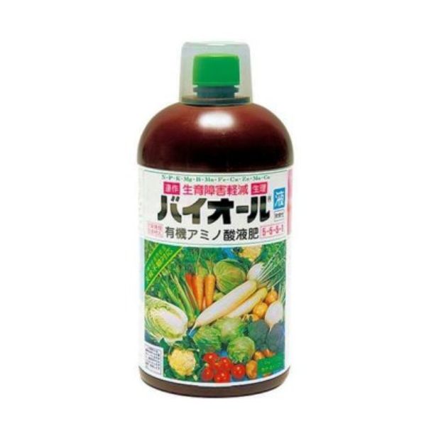連作障害の軽減と生育障害の予防に効力の高いコラーゲン動物質アミノ酸液肥で、特にやさいや果樹の日照不足には効果を発揮します。バイオール液は、厳選されたたんぱく質を完全にアミノ酸にまで加工した、唯一のアミノ酸液肥です。