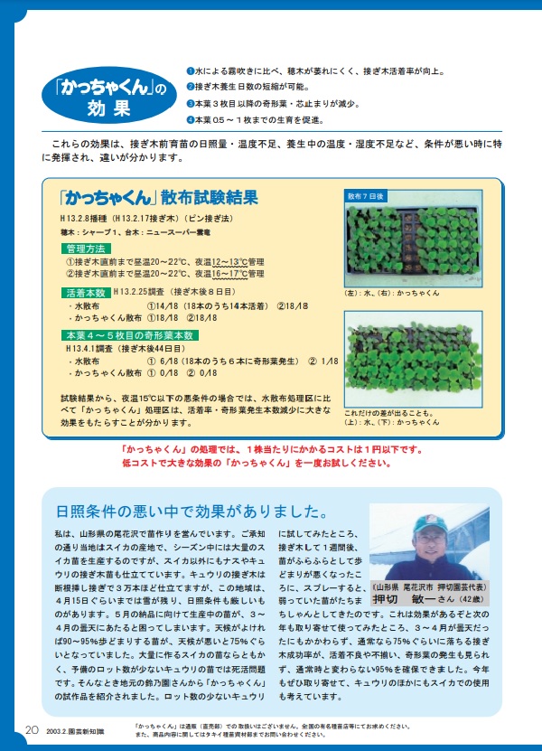 ・水による霧吹きに比べ、穂木が萎れにくく、接ぎ木活着率が向上。