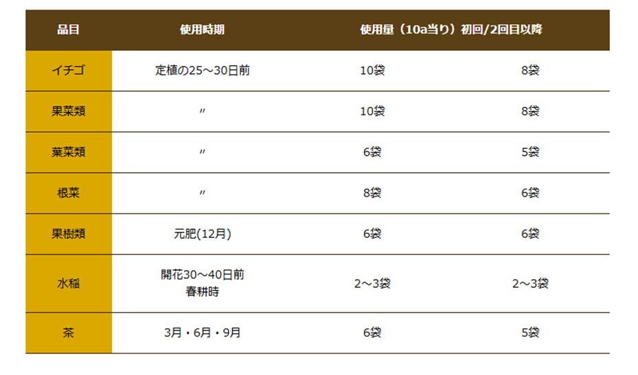 ・果菜類 使用時期:定植の25~30日前 使用量(10a当り)初回/2回目以降:10袋/8袋