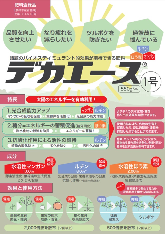 窒素・りん酸・加里を含まず、濃度により作物の様々な状況に対応できる。