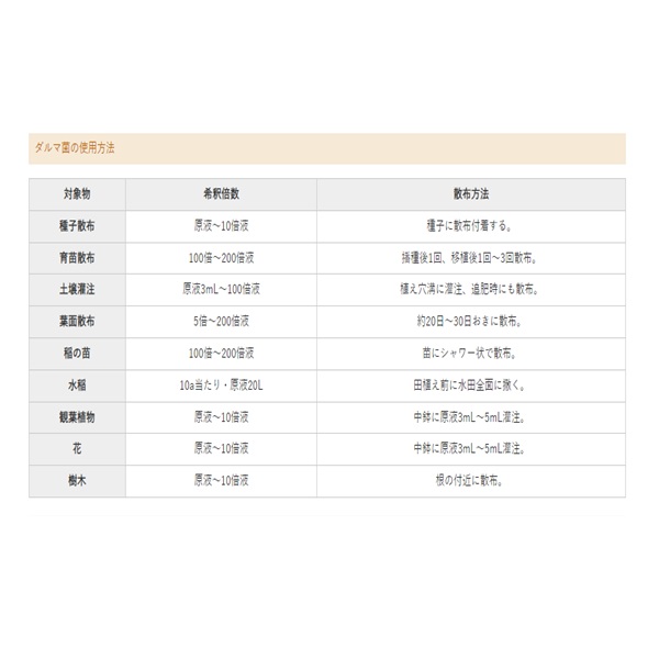 ・土壌灌注:原液3mL~100倍液/植え穴溝に灌注、追肥時にも散布。
