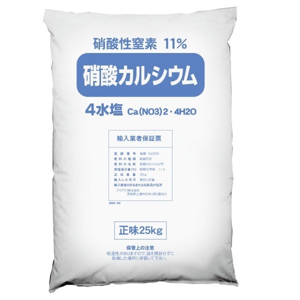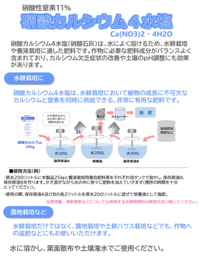 硝酸カルシウム4水塩(硝酸石灰)は、水によく溶けるため、水耕栽培や養液栽培に適した肥料です。