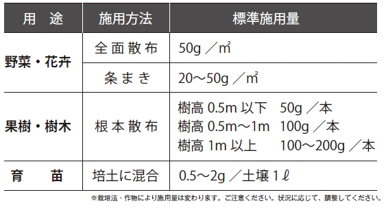 ・追肥として: 小物作物には2g~3g/土壌1リットル、大物作物には3g~10g/土壌1リットルを施用します。