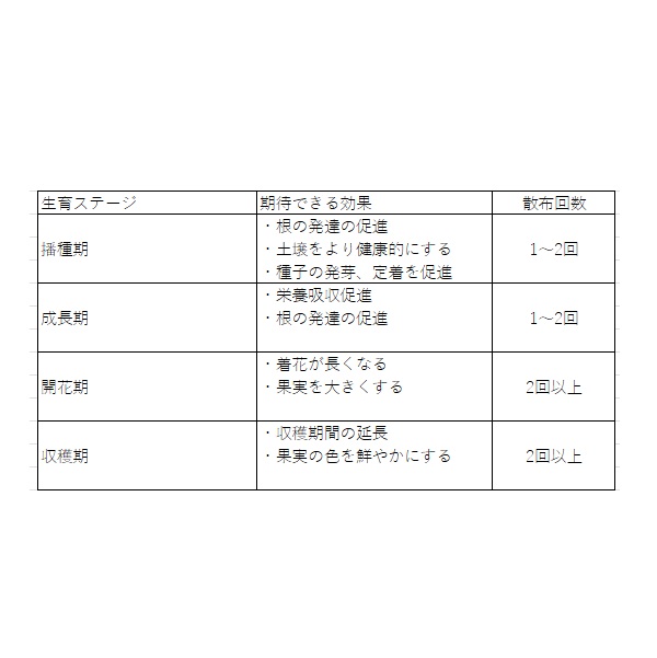 希釈倍率:500~1000倍(葉面散布・土壌灌水ともに)