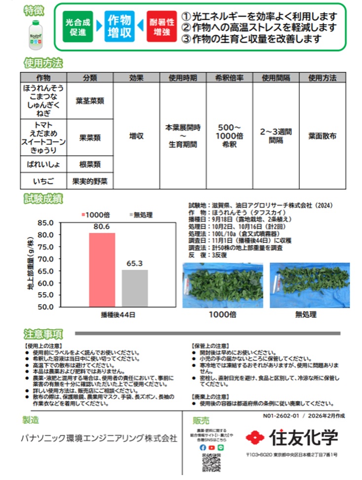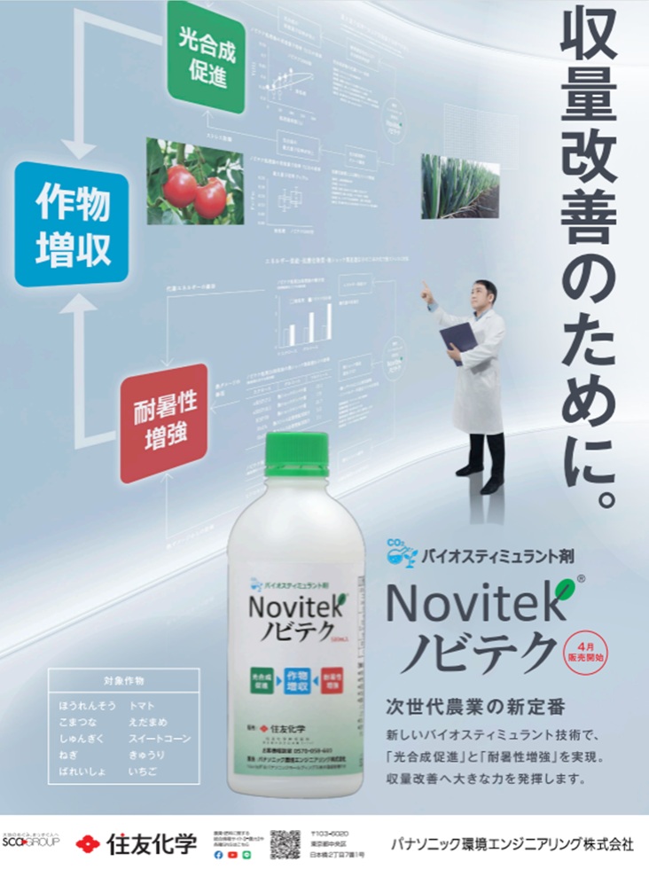 パナソニックが開発し、住友化学が展開する「ノビテク」は、光合成微生物(シアノバクテリア)由来の成分を用いたバイオスティミュラントです。
