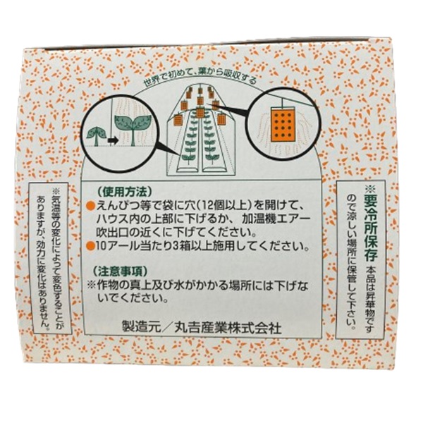 ・鉛筆などで袋に穴を開け、ハウス内の上部に下げるか、加温機エアー吸入口の近くに下げてください。